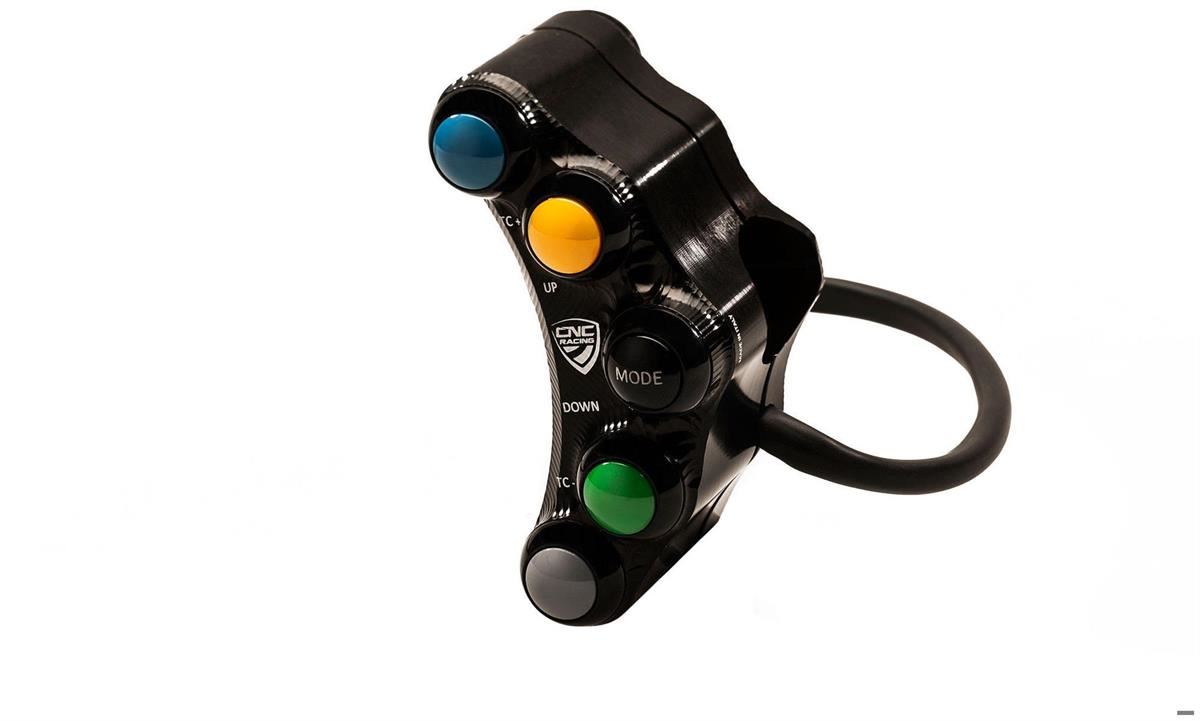 Il corpo pulsantiera è ricavato dal pieno in alluminio 7075 (Ergal) e successivamente sottoposto a processo di anodizzazione dura nera, che ne esalta le lavorazioni con i macchinari a controllo numerico. I pulsanti/interruttori utilizzati sono a norma militare IP67, norma che certifica la tenuta stagna della pulsantiera stessa. Il funzionamento di ogni pulsante è assicurato per oltre 700.000 cicli. Il montaggio plug&play è semplicissimo: basta smontare la pulsantiera originale e montare la pulsantiera CNC Racing collegando lo spinotto al cavo originale della moto. Non occorre intervenire in alcun altro modo sulla moto ed è sempre possibile tornare alla configurazione originale senza alcun tipo di modifica.