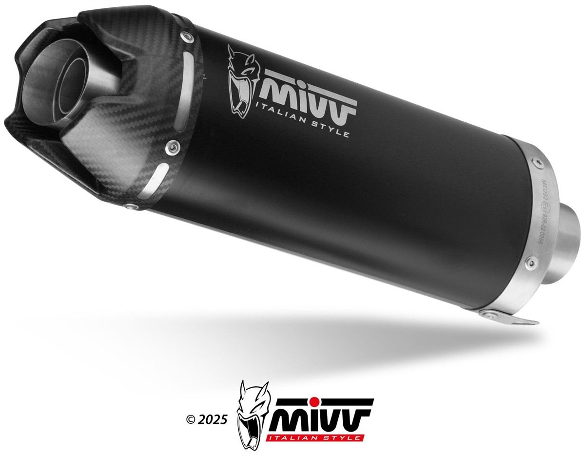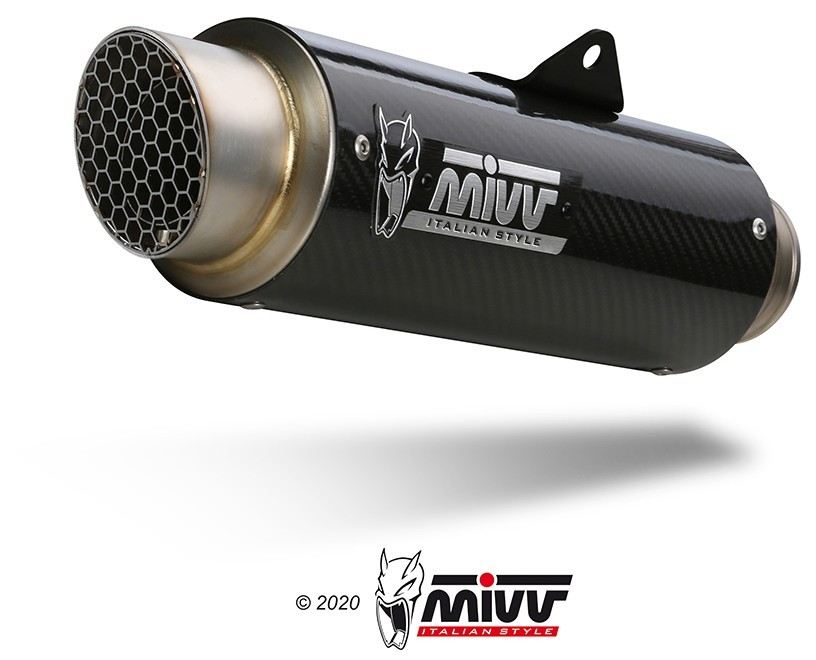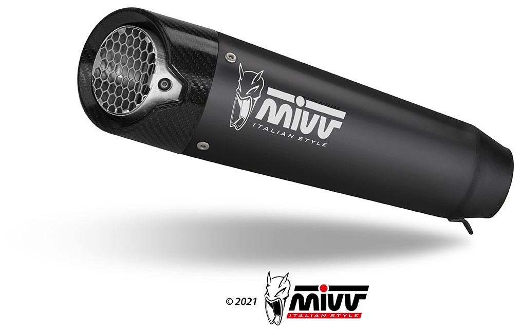 La linea Mivv X-M5, frutto dell’esperienza acquisita nei Campionati mondiali MotoGP, Moto2 e Moto3 è la perfetta sintesi tra stile racing e performance. Dal design ispirato agli scarichi realizzati per il Motomondiale, il terminale X-M5 ha una forma conica e dimensioni compatte in grado di sprigionare l’accattivante sound MIVV. E’ dotato di un fondello in carbonio twill 3K ed è dotato di una grata di protezione removibile che nasconde il dB-killer.