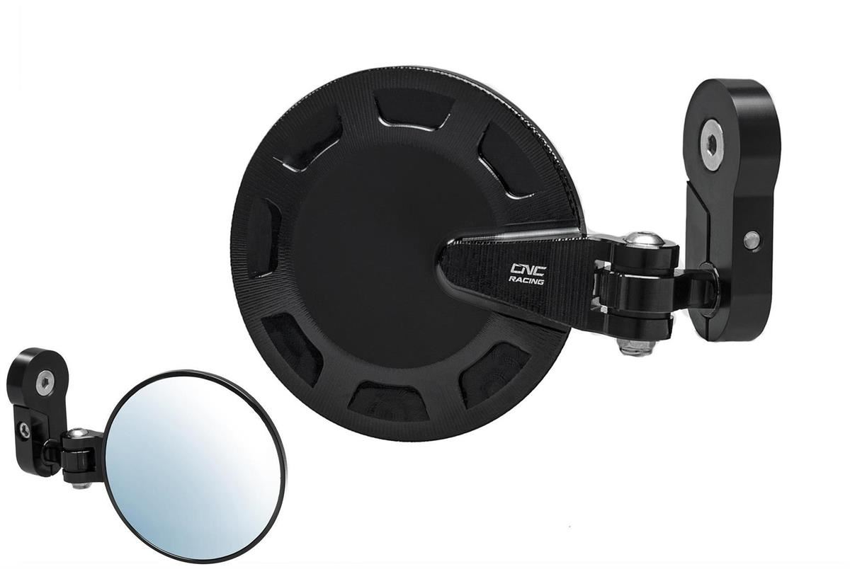 Specchietto retrovisore end-bar realizzato interamente dal pieno in lega leggera con successiva anodizzazione superficiale.