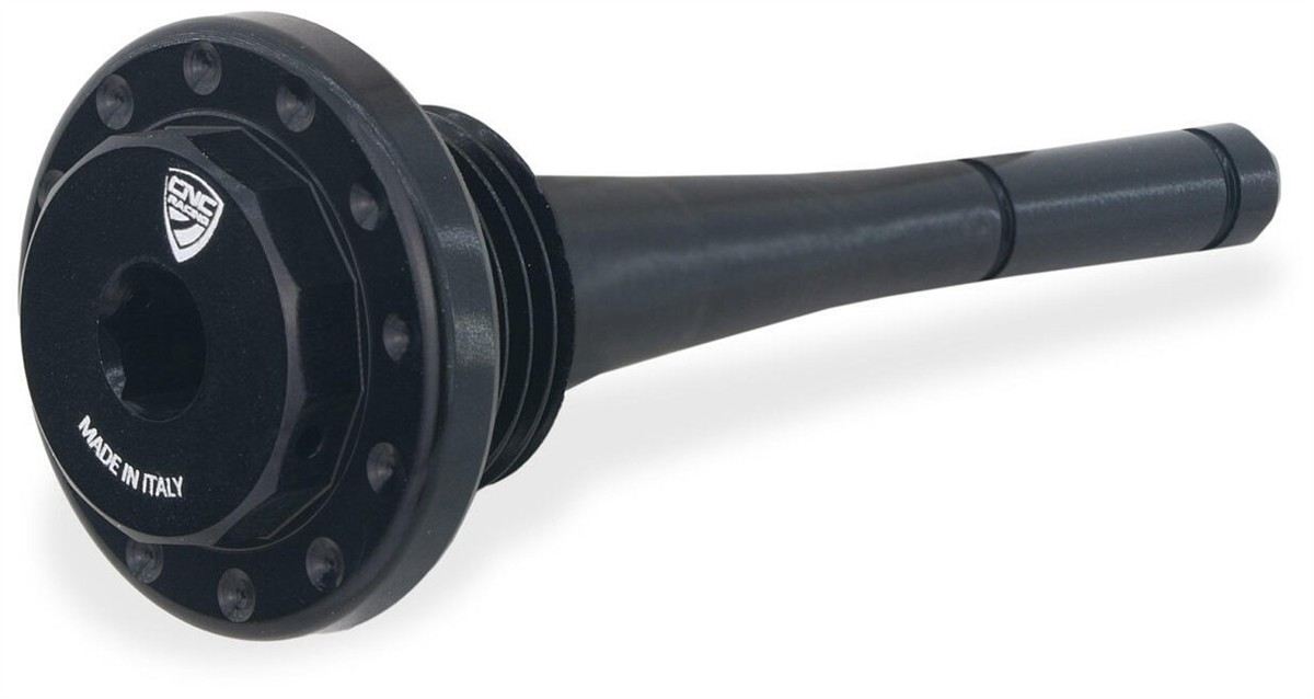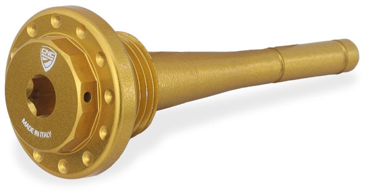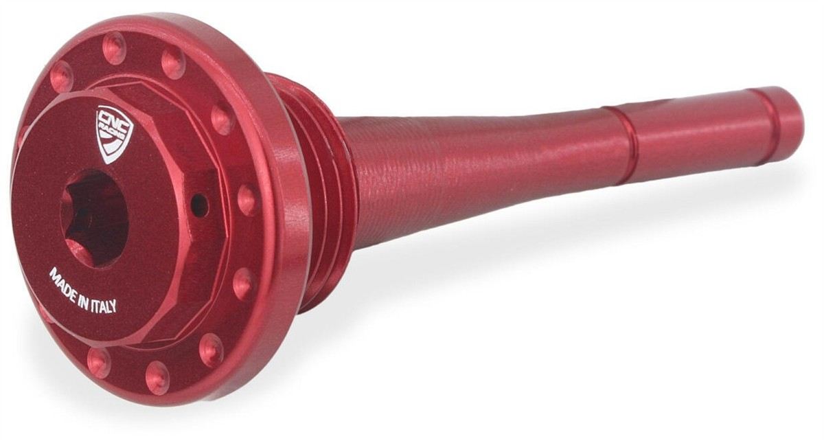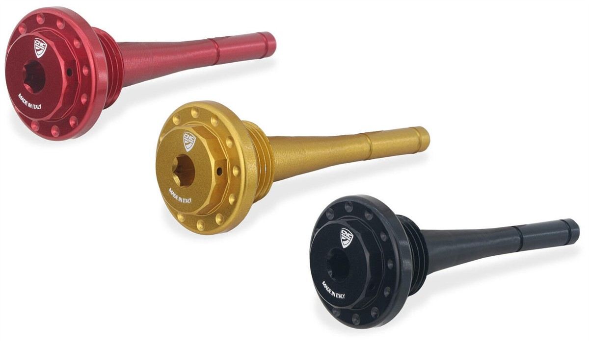 Tappo carico olio motore con asta di misurazione livello olio lavorato dal pieno tramite macchine cnc con successiva anodizzazione superficiale.