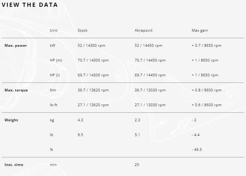 Acquistando questo silenziatore otterrai un aumento di potenza di +0.7 KW a 8650 giri, un aumento di coppia di +0.8 Nm a 8600 giri e una diminuzione di peso di -2.0 Kg rispetto all'originale