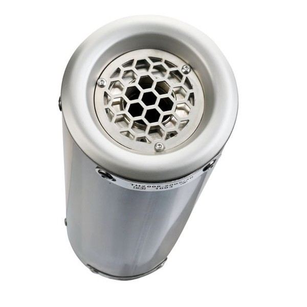 Terminale della serie M3 INOX, sviluppato grazie alle vittorie nel Mondiale Moto3, realizzato in acciaio inox satinato a mano, forma tonda di diametro 100mm, fornito con griglia racing removibile, fondelli ricavati da lavorazione Cnc.