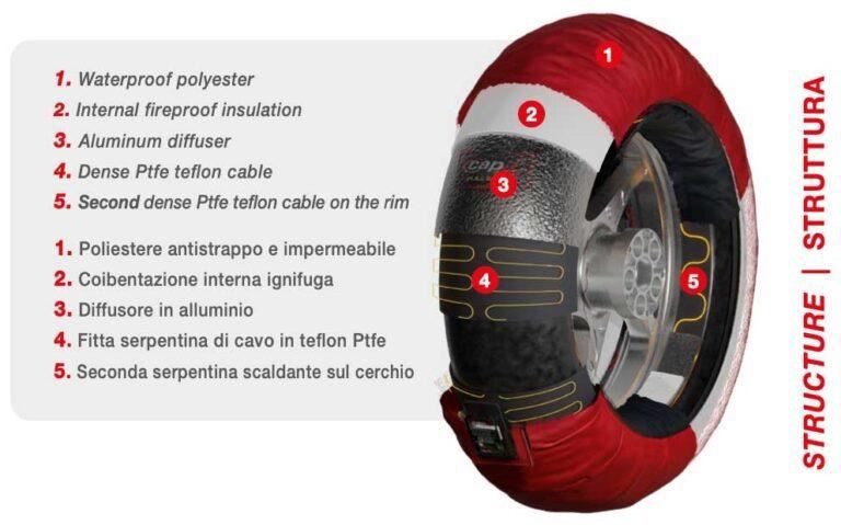 Il calore viene diffuso in modo omogeneo su tutto lo pneumatico garantendo sicurezza, aderenza della gomma in pista e prestazioni ottimali.