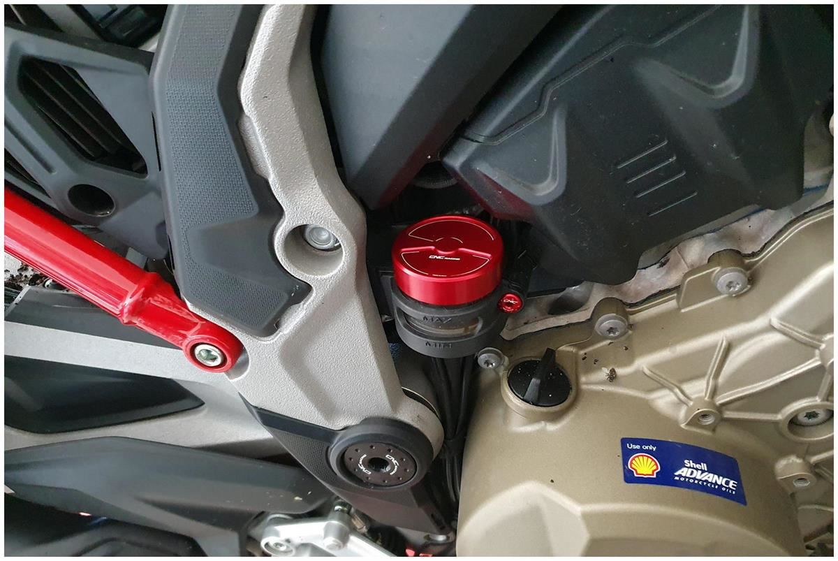 Vite fascetta serbatoio fluido freno posteriore Ducati Multistrada V4 realizzata dal pieno in lega leggera con successiva anodizzazione superficiale.